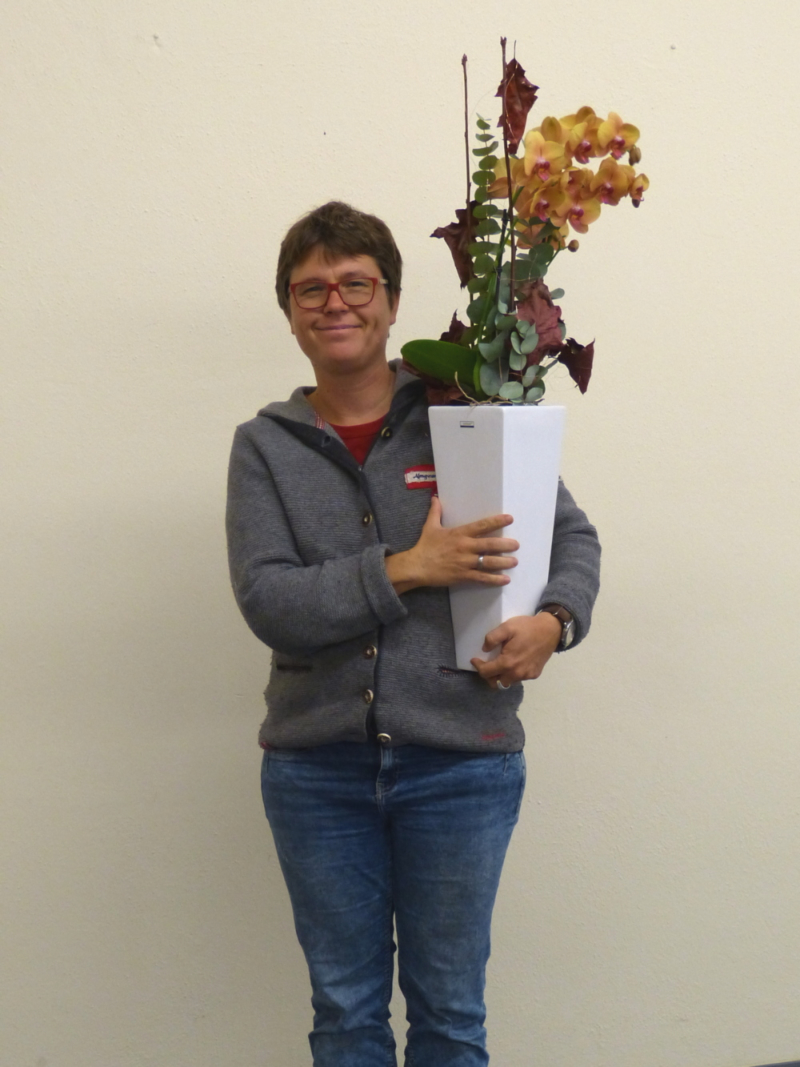 überreichte eine schöne Orchidee. Die Dirigentin arbeitet gerne mit dem Chor und würde auch gerne weitermachen.
